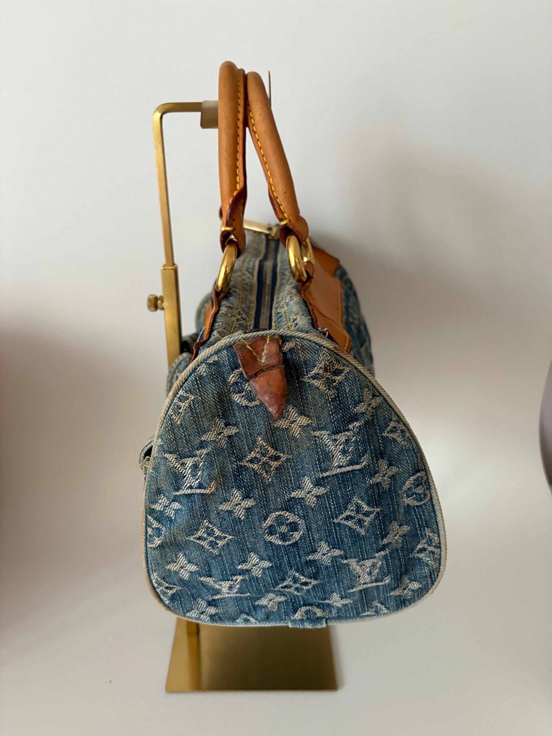 Prachtige vintage Neo Speedy van Louis Vuitton uit 2006. De tas is gemaakt van denim stof met vachetta leer en goudkleurige hardware. De tas heeft 2 front pockets met een gesp en een frontpocket met rits. De binnenkant is schoon en van stof en heeft een zijzakje.